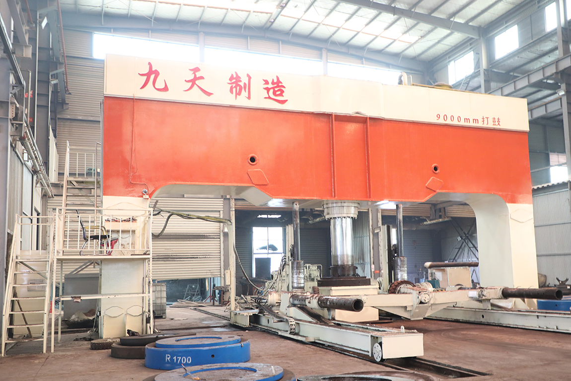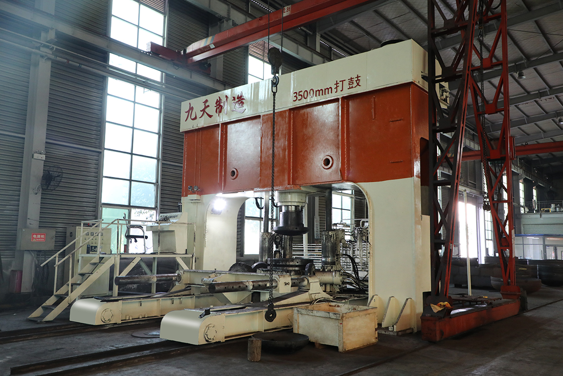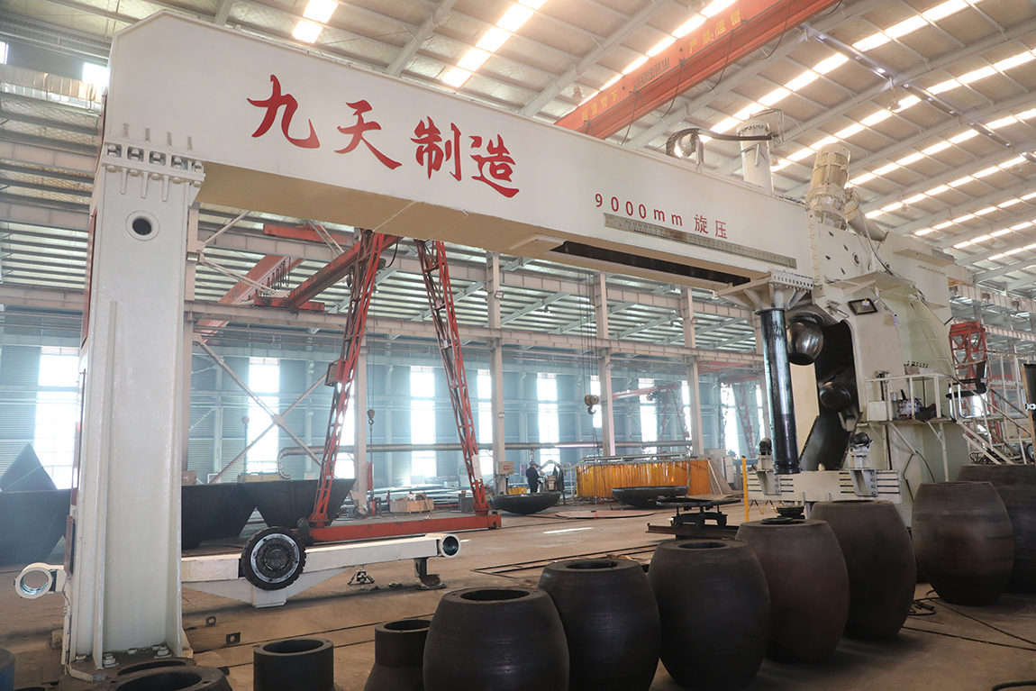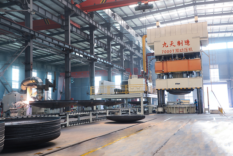 河南九天封頭制造有限公司是一家集研發(fā)、生產(chǎn)、銷售、服務(wù)于一體的國有控股公司,注冊資金為1億元。公司座落于河南省商丘市虞城縣高新技術(shù)開發(fā)區(qū),南北相臨京九鐵路、濟(jì)廣高速,東西有連霍高速、隴海鐵路穿境而過,位置優(yōu)越交通極為便利。 公司主要設(shè)備有600T—36000T的雙動壓機(jī)各1臺,3.5米—13米的旋壓機(jī)組各1套,6000W—30000W激光下料機(jī)6臺,6米、8米的等離子焊機(jī)及1米、1.6米、2.6米、5米的立車各1臺,龍門式20000W三維激光切割機(jī)、16米雙頭龍門式銑邊機(jī)、14.5米井式燃?xì)鉄崽幚頎t、直徑10米封頭專用拋丸機(jī)各1臺,最高可達(dá)1300攝氏度的8.5米、6.5米、4米、2米熱處理爐各1臺,自動拼板焊機(jī)2臺,手工焊機(jī)若干臺等,以及與之配套的電液伺服萬能試驗(yàn)機(jī)、全自動低溫沖擊試驗(yàn)機(jī)、金相顯微鏡(含磨拋機(jī)、切割機(jī))、觸摸屏式硬度計、臺式直讀光譜儀等各類金屬實(shí)驗(yàn)設(shè)備。